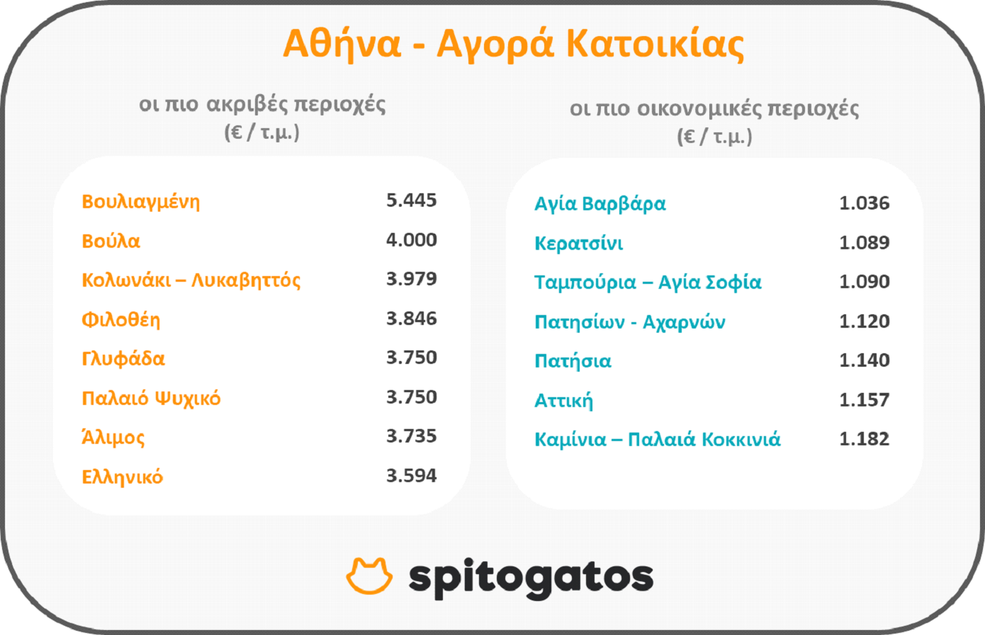 Συγκεκριμένα, οι ακριβότερες περιοχές για αγορά κατοικίας στο λεκανοπέδιο είναι, μεταξύ άλλων, η Βουλιαγμένη και η Βούλα, η περιοχή του Κολωνακίου και του Λυκαβηττού, η Φιλοθέη, η Γλυφάδα, το Παλαιό Ψυχικό, ο Άλιμος και το Ελληνικό. Στις οικονομικότερες περιοχές για αγορά κατοικίας το πρώτο τρίμηνο του 2022 είναι η Αγία Βαρβάρα, το Κερατσίνι και η περιοχή Ταμπούρια – Αγία Σοφία στον Πειραιά.