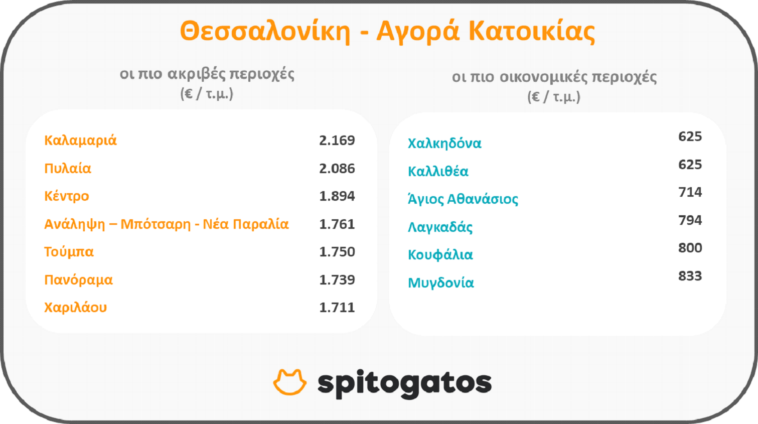 Αντίστοιχα, στη Θεσσαλονίκη, οι πιο ακριβές περιοχές για αγορά κατοικίας το α’ τρίμηνο του 2022 ήταν, μεταξύ άλλων, η Καλαμαριά, η περιοχή του κέντρου και το Πανόραμα -στοιχείο το οποίο δεν προκαλεί εντύπωση καθώς πρόκειται για περιοχές που παραδοσιακά ανήκουν στις ακριβότερες τις συμπρωτεύουσας, η περιοχή Ανάληψη – Μπότσαρη – Νέα Παραλία, η Πυλαία και η Τούμπα. Ως προς την αγορά κατοικίας, οι οικονομικότερες περιοχές περιλαμβάνουν, μεταξύ άλλων, την Καλλιθέα, τη Χαλκηδόνα, τον Άγιο Αθανάσιο, τον Λαγκαδά και τα Μυγδόνια.