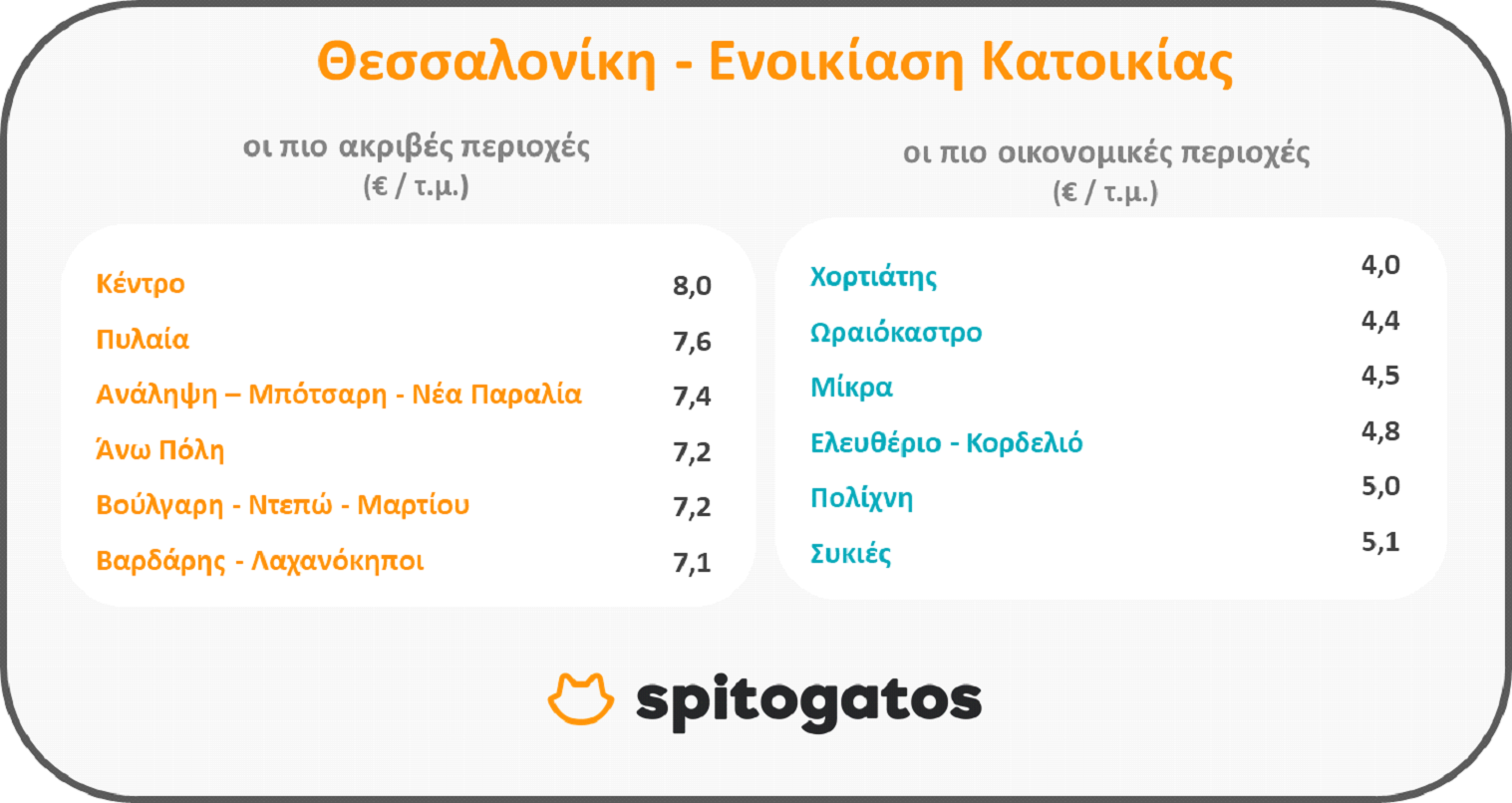 Σε ό,τι αφορά την ενοικίαση κατοικίας, οι ακριβότερες περιοχές ήταν, πέραν του κέντρου της πόλης, η Πυλαία, η Ανάληψη – Μπότσαρη – Νέα Παραλία, η Άνω Πόλη και οι περιοχές Βούλγαρη – Ντεπώ – Μαρτίου και Βαρδάρης – Λαχανόκηποι. Στις οικονομικότερες περιοχές για ενοικίαση κατοικίας, εντοπίζονται ο Χορτιάτης, το Ωραιόκαστρο, ο Δήμος Μίκρας, η Πολίχνη και οι Συκιές.