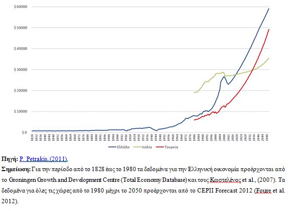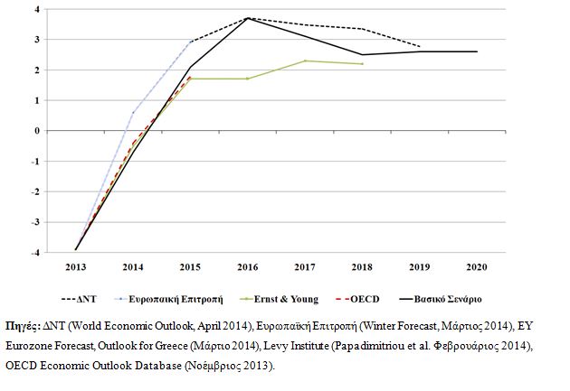 Η Ανάκαμψη της ΟικονομίαςΗ οικονομική ανάκαμψη της οικονομικής δραστηριότητας σε μία οικονομία δε συνεπάγεται αυτόματες, επιπτώσεις είτε στα εισοδήματα είτε στην ανεργία παρόλο που οι συσχετίσεις είναι σαφώς θετικές. Συνήθως διαπιστώνονται διαφοροποιήσεις είτε στην έκταση είτε στο χρόνο αλληλεπιδράσεων. Παρόλα αυτά η προσοχή όλων εστιάζεται στην εξέλιξη του ΑΕΠ διότι αυτή θα σηματοδοτήσει τις εξελίξεις.Η τροχιά ανάκαμψης της Ελληνικής οικονομίας μετά από έξι χρόνια βαθύτατης ύφεσης θα επηρεαστεί από το διεθνές περιβάλλον στο οποίο κινείται η Ελληνική οικονομία και τη συγκυρία που θα επικρατήσει, θα εκφράζει τις ιδιαιτερότητες της επανάκαμψης από τις αδυναμίες του παρελθόντος και βεβαίως θα εκφράζει το παραγωγικό πρότυπο που υπάρχει και θα επικρατήσει.Για την εξέλιξη της ανάκαμψης της οικονομίας θα μπορούσαμε να διακρίνουμε μία μεσοπρόθεσμη, για τα επόμενα ένα έως πέντε χρόνια, και μία μακροπρόθεσμη οπτική.1. Η Μακροπρόθεσμη ΟπτικήΗ μακροπρόθεσμη διάσταση της εξέλιξης της Ελληνικής οικονομίας είναι εξαιρετικά ενδιαφέρουσα αλλά έχει πολύ υψηλότερη αβεβαιότητα. Παίρνει περισσότερο τη μορφή ενός οραματισμού και λιγότερο το χαρακτήρα της πρόβλεψης. Όμως έχει αξία διότι δημιουργεί την εικόνα έστω της μακρινής προοπτικής της οικονομίας.Διάγραμμα 1. Η εξέλιξη του κατά κεφαλήν ΑΕΠ της Ελλάδας από το 1821 έως το 2050 (σε χιλιάδες δολάρια, 2005=100)Το Διάγραμμα 1 αυτό δείχνει την εξέλιξη του κατά κεφαλήν ΑΕΠ στην Ελλάδα από το 1828 έως το 2050 (!) με την προϋπόθεση ότι δε θα υπάρξουν βαριές αιφνιδιαστικές ανατροπές. Το παραγωγικό σύστημα θα συνεχίζει να παράγει και ο πλούτος της οικονομίας και των ανθρώπων να αυξάνεται.Δεν λέει τίποτα βεβαίως για το πώς θα διανέμεται ο πλούτος αυτός. Άρα το Διάγραμμα 1 δε λέει τίποτα για την ουσία της πολιτικής πάλης παρόλο που έχει δημιουργηθεί με τη βασική υπόθεση της μη μεταβολής των συνθηκών λειτουργίας των οικονομιών όπως αυτές έχουν διαμορφωθεί την περίοδο 2010 – 2012. Έτσι με κάποιο τρόπο βασίζεται εντός ορισμένων ορίων όσον αφορά τουλάχιστον στην εξέλιξη των πολιτικών πραγμάτων.Για την εξέλιξη της ανάκαμψης στην Ελληνική οικονομία υπάρχουν αρκετές διισταμένες απόψεις από τις οποίες οι πλέον απαισιόδοξες έχουν και αυτές ως βάση μια χαμηλή θετική εξέλιξη του ΑΕΠ. Οι πλέον αισιόδοξες για το 2014 είναι αυτές της Κυβέρνησης όπως έχουν αποτυπωθεί στο Προσχέδιο του Κρατικού Προϋπολογισμού (ανάπτυξη 0,6% το 2014) αλλά και της Alpha Bank που βλέπει υπό ορισμένες συνθήκες μία ανάπτυξη για το 2014 ακόμη μεγαλύτερη στο 1,1%.Επίσης έχουν διατυπωθεί προβλέψεις από την Ευρωπαϊκή Επιτροπή, το ΔΝΤ και την Ernst and Young. Οι προβλέψεις αυτές καταγράφονται στο Διάγραμμα 2.Διάγραμμα 2. Προβλέψεις οργανισμών για τη Μεγέθυνση στην Ελληνική οικονομίαΠρόσφατα, αναπτύξαμε (με τη βοήθεια συνεργατών) ένα νέο μακρο-οικονομετρικό μοντέλο για την Ελληνική οικονομία και θα δοθεί στη δημοσιότητα προσεχώς. Το μοντέλο εκτιμήθηκε χρησιμοποιώντας τριμηνιαία στοιχεία για την περίοδο 2000-2013 και οι κύριοι στόχοι του είναι να είναι απλό, ευέλικτο σε όρους ανάλυσης πολιτικών και να παρέχει αιτιολογημένες εκτιμήσεις για την περίοδο 2014-2020.Αναφερόμενοι στο ζήτημα της ύπαρξης διαφορετικών εκτιμήσεων για το προσεχές μέλλον, οφείλουμε να πούμε ότι δε γνωρίζουμε τις ακριβείς υποθέσεις που χρησιμοποιούνται για να μπορέσουμε να αξιολογήσουμε την επιστημονική αξ