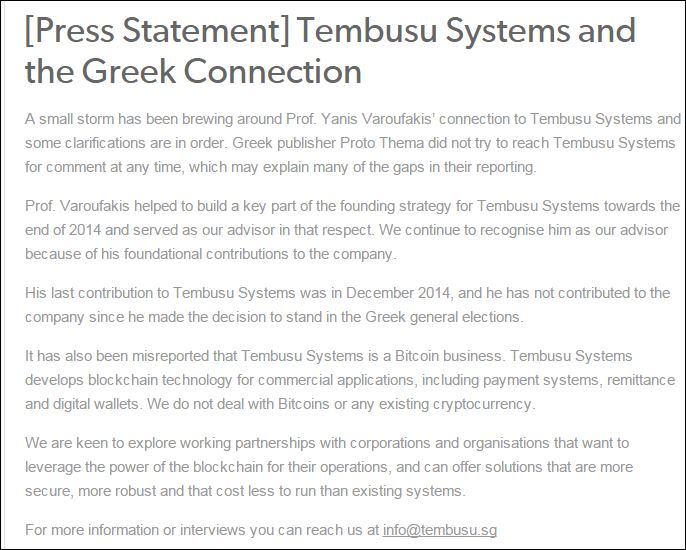 “Ο καθηγητής Βαρουφάκης βοήθησε στην οικοδόμηση ενός σημαντικού κομματιού της ιδρυτικής στρατηγικής της Tembusu Systems λίγο πριν το τέλος του 2014 και εργάστηκε ως σύμβουλος στον τομέα αυτό. Συνεχίζουμε να τον αναγνωρίζουμε ως σύμβουλό μας λόγω αυτής της ιδρυτικής συμβολής του στην εταιρεία.