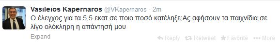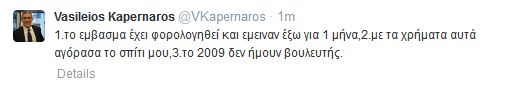 Παράλληλα, ο Βασίλης Καπερνάρος έδωσε εξηγήσεις μέσω του προσωπικού του λογαριασμού στο Twitter, επισημαίνοντας ότι το έμβασμα για το οποίο τον κατηγορούν έχει φορολογηθεί και έμεινε στο εξωτερικό μόνο για ένα μήνα. Την ίδια στιγμή, ξεκαθάρισε ότι με τα χρήματα αυτά αγόρασε το σπίτι του και υπογράμμισε πως το 2009 δεν κατείχε το αξίωμα του βουλευτή. Τέλος, ο βουλευτής των Ανεξάρτητων Ελλήνων, κάλεσε όσους τον κατηγορούν να «αφήσουν τα παιχνίδι».