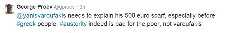 «Ο κ. Βαρουφάκης θα πρέπει να απαντήσει για το κασκόλ του, που κοστίζει 500 ευρώ και ειδικά στους Έλληνες πολίτες. Τελικά η λιτότητα είναι αρνητική για τους φτωχούς, αλλά όχι για τον κ. Βαρουφάκη», έγραψε.
