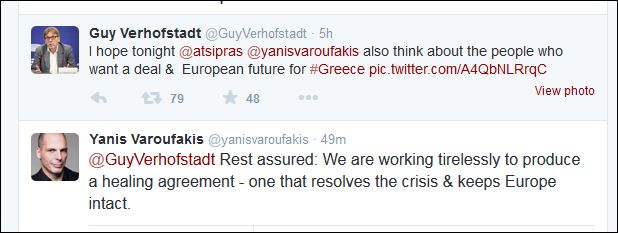 Συγκεκριμένα ο Βέλγος πολιτικός έγραψε: «Ελπίζω απόψε ο Τσίπρας και ο Βαρουφάκης να σκεφτούν και τους ανθρώπους που θέλουν μία συμφωνία και ευρωπαϊκό μέλλον για την Ελλάδα», δημοσιεύοντας φωτογραφίες από τη συγκέντρωση «Μένουμε Ευρώπη» στο Σύνταγμα.
