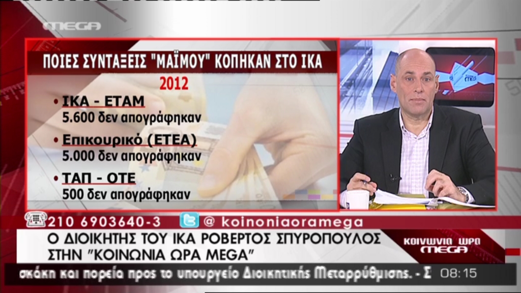 Ούτε 50, ούτε 100, αλλά 3.500 συνταξιούχοι δεν εμφανίστηκαν ποτέ στο ΙΚΑ για την απογραφή, με αποτέλεσμα, σύμφωνα με τον διοικητή του ΙΚΑ, Ροβέρτο Σπυρόπουλο, να προκύψει οικονομικό όφελος 64 εκατ. ευρώ. Συγκεκριμένα, το 2011 πληρώθηκαν 24 εκατ. ευρώ σε “μαϊμού” συντάξεις και 40 εκατ. ευρώ το 2012.