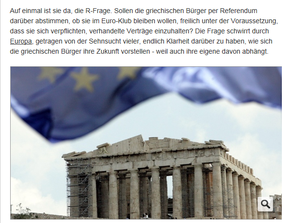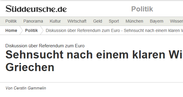 Η Sueddeutsche Zeitung, σε άρθρο με τον τίτλο “Δημοψήφισμα για το ευρώ” και υπότιτλο “Ευρωπαίοι θέλουν να ψηφίσουν οι Έλληνες”, περιγράφει τα χθεσινά γεγονότα, ενώ σε ανταπόκριση από την Αθήνα υπό τον τίτλο “Αθηναϊκή γλωσσική σύγχυση”, σημειώνεται ότι “ο λόγος για τον οποίο κυκλοφορεί στην Ευρώπη η ιδέα του δημοψηφίσματος είναι η επιθυμία πολλών να αποσαφηνιστεί επιτέλους το πώς φαντάζονται οι Έλληνες το μέλλον τους – επειδή από αυτό εξαρτάται και το μέλλον των Ευρωπαίων”.Μεταφέρονται δε δηλώσεις του Μάρτιν Σουλτς για το θέμα: “Χρονικά και νομικά είναι μάλλον δύσκολο. Είναι κάτι επί του οποίου πρέπει να αποφασίσουν οι Έλληνες πολιτικοί”, αλλά αναγράφονται και οι αντιδράσεις των κομμάτων.