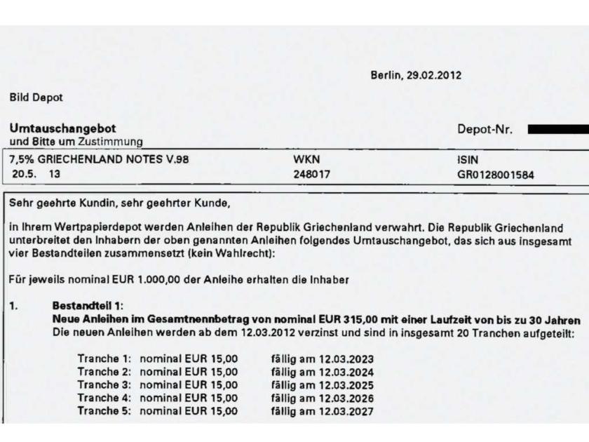 Όχι μόνο αγόρασε Ελληνικά ομόλογα η Γερμανική εφημερίδα, αλλά όπως υποστηρίζουν οι συντάκτες της, έλαβε έγγραφη πρόσκληση για την συμμετοχή της στο “κούρεμα του Ελληνικού χρέους”. Και βέβαια, με ρεπορτάζ που φέρει τίτλο: “ΛΕΜΕ ΟΧΙ”στην συμμετοχή μας στο κούρεμα του Ελληνικού χρέους απαντούν στο Ελληνικό Δημόσιο!”Το κούρεμα του ελληνικού χρέους έφτασε και στους ιδιώτες μικροεπενδυτές” γράφει η Γερμανική εφημερίδα Bild.de και συνεχίζει “έφτασε ακόμα και στην Bild. Αλλά εμείς λέμε όχι!” τονίζει η εφημερίδα.(Αλίμονο δεν περιμέναμε κάτι διαφορετικό…λέμε εμείς.)Η Bild τον Δεκέμβρη του 2011 αγόρασε ομόλογα του ελληνικού Δημοσίου αξίας 4.815 ευρώ τα οποία στις 20 Μαρτίου του 2012 (η ημερομηνία που λήγουν τα συγκεκριμένα ομόλογα) θα έφταναν την αξία των 10.000 ευρώ, ποσό που θα εξαργύρωνε η εφημερίδα. Ωστόσο με βάση το ποσοστό του κουρέματος που έχει συμφωνηθεί, δηλαδή το 70%, η εφημερίδα ισχυρίζεται ότι θα χάσει 7.000, ενώ τα 3.000 ευρώ που απομένουν, η Bild θα μπορούσε να τα εισπράξει σε δόσεις μέχρι το 2042. Η γερμανική εφημερίδα λοιπόν θα εισέπραττε 7000 ευρώ λιγότερα από την ονομαστική αξία των ομολόγων, και θα έχανε 38% από την αξία που τα αγόρασε (τα 4.815 ευρώ).Και επαναλαμβάνει με στόμφο ότι σε αυτή τη διαδικασία λέει “όχι”.Ωστόσο ο λόγος που αρνείται να συμμετλασχει στη διαδικασία -όπως διευκρινίζει στη συνέχεια- είναι ότι το “κούρεμα” δεν θα αποτελέσει “πραγματική βοήθεια για την Ελλάδα”.και εξηγεί:”-Εμείς δεν κρίνουμε ως ρεαλιστικούς τους στόχους που έχουν τεθεί για την Ελλάδα, ιδίως την ώρα που το ΔΝΤ και η Ε.Ε. ετοιμάζουν και τρίτο πακέτο βοήθειας για την Ελλάδα.-Μια μερική διαγραφή των χρεών δεν θα βοηθήσει τη χώρα να σταθεί στα πόδια της. Αυτό που θα τη βοηθήσει είναι η έξοδος από την Ευρωζώνη.-Τον Απρίλη στην Ελλάδα θα γίνουν εκλογές και κατά πάσα πιθανότητα η νέα ελληνική κυβέρνηση δεν θα τηρήσει τις δεσμέυσεις”.Τέλος σημειώνει πως θα απέχει από τη διαδικασία του κουρέματος παρ’ ότι η Γερμανική Ένωση Προστασίας Αξιών (DSW) συμβουλεύει τους μικροεπενδυτές να πάρουν μέρος στη διαδικασία ενώ διευκρινίζει “Ακόμα και αν η Bild κερδίσει τελικά κάτι από τα ελληνικά ομόλογα, τα χρήματα θα διατεθούν για φιλανθρωπικούς σκοπούς”. Αυτό είναι το έγγραφο με το οποίο η ελληνική κυβέρνηση ζήτησε από τη Bild να συμμετάσχει στο “κούρεμα”: