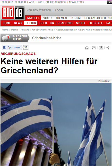 “Τέλος με την οικονομική βοήθεια προς την Ελλάδα;” είναι ο τίτλος δημοσιεύματος της γερμανικής εφημερίδας Bild που αναφέρεται στις απειλές των Ευρωπαίων αξιωματούχων εναντίον της χώρας μας -σε περίπτωση που δεν εφαρμοστεί το πρόγραμμα λιτότητας.”Η Ελλάδα βυθίζεται και πάλι στο χάος” γράφει με ‘στόμφο’ η Bild ενώ “ο σχηματισμός κυβέρνησης φαντάζει πολύ μακριά. “Πολλοί Ευρωπαίοι πολιτικοί -μεταξύ των οποίων και οι Γερμανοί- είναι ιδιαίετρα ανήσυχοι για αυτό, ενώ έχουν ήδη προειδοποιήσει τους Έλληνες:Αν δεν προκύψει μια σταθερή κυβέρνηση και μάλιστα γρήγορα, θα σταματήσει η παροχή βοήθειας προς την υπερχρεωμένη χώρα” σημειώνει η εφημερίδα. Στέλεχος των Φιλελευθέρων, (FDP), ο Πάτρικ Ντέρινγκ, δήλωσε στη Bild:”Αν δεν σχηματιστεί στην Ελλάδα μια συνετή κυβέρνηση -και γρήγορα-, τα ενδεχόμενα είναι πολύ άσχημα για τη χώρα. Το πιθανότερο είναι τον Ιούνιο, η τρόικα να διακόψει την παροχή βοήθειας.””Οι ίδιοι θα φταίνε” σχολιάζει η Bild. Ο πρόεδρος του Ευρωπαϊκού Κοινοβουλίου, Μάρτιν Σουλτς, δήλωσε επίσης στη Bild:”Τα ελληνικά κόμματα θα πρέπει να γνωρίζουν ότι μια σταθερή κυβέρνηση που θα συμμορφώνεται με τις δεσμεύσεις, αποτελεί προϋπόθεση για τη συνέχιση της υποστήριξης από την ευρωζώνη.” “Αλλά και οι αξιωματούχοι του υπουργείου Εσωτερικών (της Γερμανίας) βρίσκονται σε μεγάλη ανησυχία. Ο Φιλελεύθερος, Όττο Φρίκε συγκεκριμένα είναι σε αναμμένα κάρβουνα: Στην Ελλάδα θα πρέπει όλοι να γνωρίζουν ότι η μη τήρηση των δεσμεύσεων σημαίνει αυτομάτως και τη διακοπή της βοήθειας”. “Οι Έλληνες πολιτικοί θα πρέπει να ξέρουν ότι επιβάλλεται να καταλήξουν γρήγορα σε μια σταθερή κυβέρνηση που θα συμμορφώνεται με τις επιταγές της Ευρώπης, αλλιώς η ‘βρύση με τα χρήματα’ θα σταματήσει να τρέχει…” γράφει η Bild κλείνοντας.