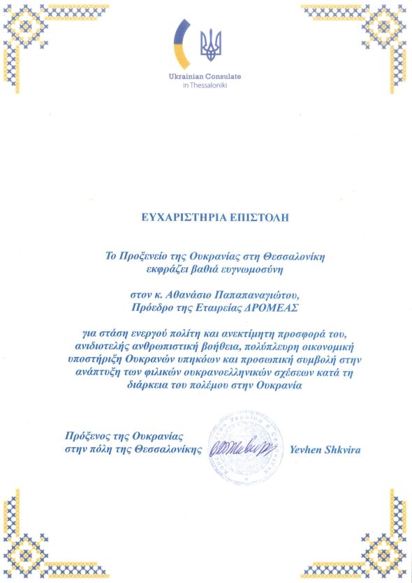 Την Παρασκευή, 12/04/2024 επισκέφθηκε την εταιρεία ΔΡΟΜΕΑΣ ο Πρόξενος της Ουκρανίας, κύριος Yevhen Shkvira, προσκομίζοντας την συνημμένη ευχαριστήρια επιστολή.
