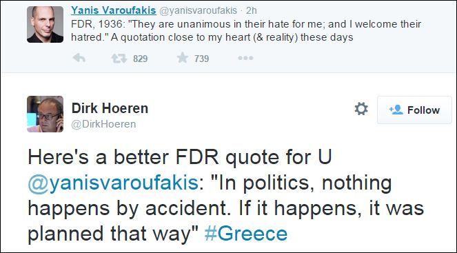 “Αυτή είναι μια καλύτερη φράση του Ρούσβελτ για σένα: Στην πολιτική τίποτα δεν συμβαίνει στην τύχη. Αν συμβεί, έτσι είχε σχεδιαστεί” έγραψε χαρακτηριστικά στον υπουργό Οικονομικών ο Dirk Hoeren.