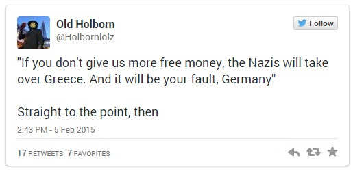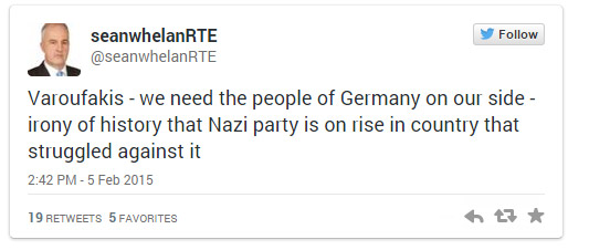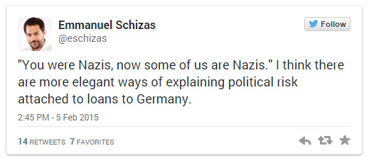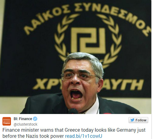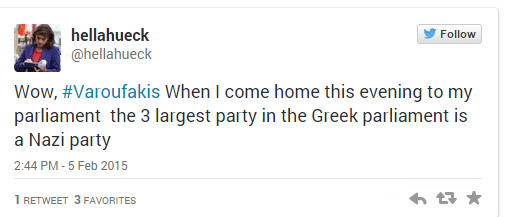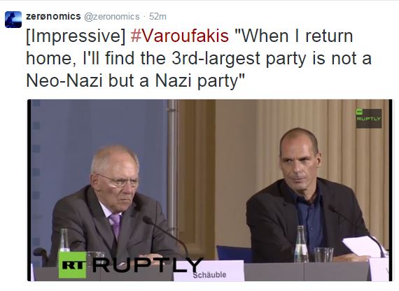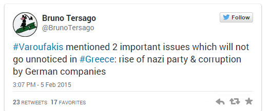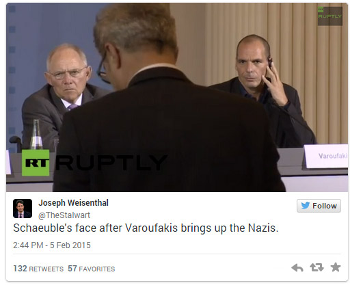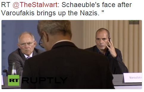 Στο θέμα του ναζισμού αναφέρθηκε μεταξύ άλλων ο Έλληνας υπουργός Οικονομικών Γιάνης Βαρουφάκης, κατά τη διάρκεια της κοινής συνέντευξης Τύπου με τον Γερμανό ομόλογό του, Βόλφγκανγκ Σόιμπλε, στο Βερολίνο.