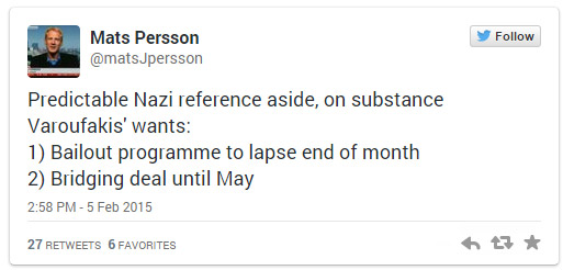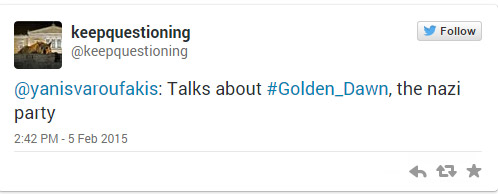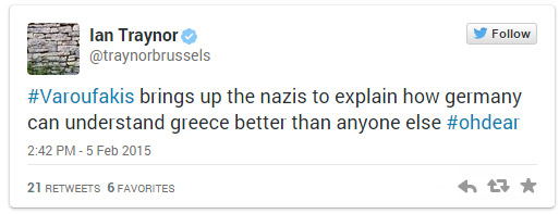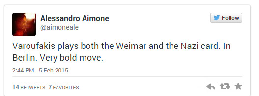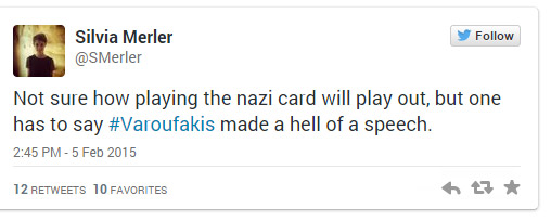 Η αναφορά του Γιάνη Βαρουφάκη στον ναζισμό προκάλεσε ποικίλα σχόλια σε κάποιους από τους χρήστες του γνωστού κοινωνικού μέσου, Twitter.