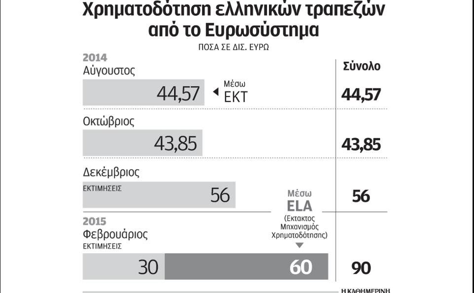 Επιτελικά στελέχη τραπεζών, μιλώντας στην «Καθημερινή», αναγνωρίζουν ότι σχεδόν έχει απορροφηθεί το σύνολο της ρευστότητας που ήταν διαθέσιμη μέσω ELA (60 δισ. ευρώ), ενώ η συνολική εξάρτηση από τη ρευστότητα του ευρωσυστήματος «αγγίζει» τα 90 δισ. ευρώ. Η ραγδαία επιδείνωση των συνθηκών ρευστότητας οφείλεται στην πολιτική αναταραχή, την αβεβαιότητα που προκάλεσαν οι πρόωρες εκλογές και τώρα στη δυστοκία της νέας κυβέρνησης να καταλήξει σε συμφωνία με τους εταίρους. Τον περασμένο Δεκέμβριο, οι καταθέσεις μειώθηκαν κατά 4 δισ. ευρώ, τον Ιανουάριο κατά περίπου 12 δισ. ευρώ, ενώ τον Φεβρουάριο, μέχρι τώρα, η μείωση των καταθέσεων εκτιμάται σε 3 δισ. ευρώ.