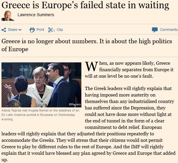Η Ελλάδα μπορεί να βρίσκεται στα πρόθυρα να γίνει ένα «αποτυχημένο κράτος», γράφει ο νεοκεϊνσιανός οικονομολόγος Λόρενς Σάμερς. Η Ελλάδα δεν είναι πλέον απλά αριθμοί, γράφει. Αφορά στην κεντρική πολιτική στις κορυφές της Ευρώπης, υπογραμμίζει ο πρώην υπουργός Οικονομικών των ΗΠΑ στην κυβέρνηση Κλίντον, που ζωγραφίζει ζοφερό σενάριο εάν δεν κλείσει συμφωνία.
