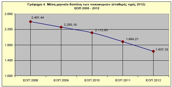 Η μέση μηνιαία δαπάνη των νοικοκυριών, για το 2012, ανήλθε στα 1.637,10 ευρώ, καταγράφοντας μείωση κατά 10,2%, σε σύγκριση με το 2011. Σε πραγματικούς όρους, η μέση μηνιαία δαπάνη μειώθηκε, κατά 11,6%, λόγω της επίδρασης του πληθωρισμού, σύμφωνα με τον Δείκτη Τιμών Καταναλωτή του έτους 2012.