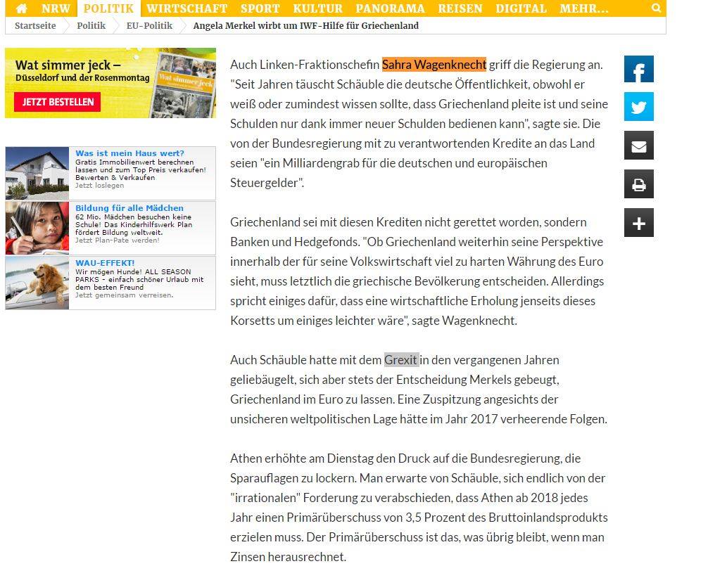 Η κ. Βάγκενκνεχτ παράλληλα μίλησε με σκληρά λόγια για τον Βόλφγκανγκ Σόιμπλε. «Ο Βόλφγκανγκ Σόιμπλε εξαπατά επί χρόνια τον γερμανικό λαό καθώς ξέρει ή πρέπει να ξέρει ότι η Ελλάδα έχει χρεοκοπήσει», υπογράμμισε σε συνέντευξή της στην εφημερίδα «Rheinische Post».