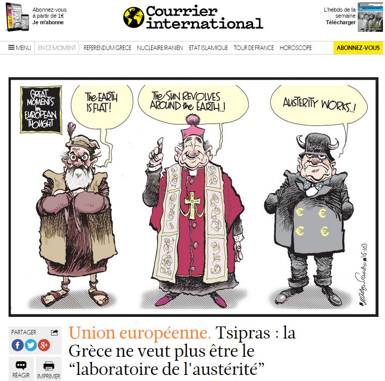 Η Courrier αναφέρεται στον Τσίπρα… ως νέο Γαλιλαίο απέναντι στο ιερατείο των Βρυξελλών με ένα σκίτσο, βασισμένo στη δήλωσή του ότι η Ελλάδα δεν θέλει να είναι ένα «εργαστήρι λιτότητας».