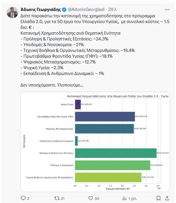 Την κατανομή της χρηματοδότησης στο πρόγραμμα Ελλάδα 2.0, για τα 50 έργα του υπουργείου Υγείας, με συνολικό κόστος 1,5 δισ. ευρώ παρουσίασε σε ανάρτησή του στο Χ ο υπουργός Υγείας Άδωνις Γεωργιάδης.