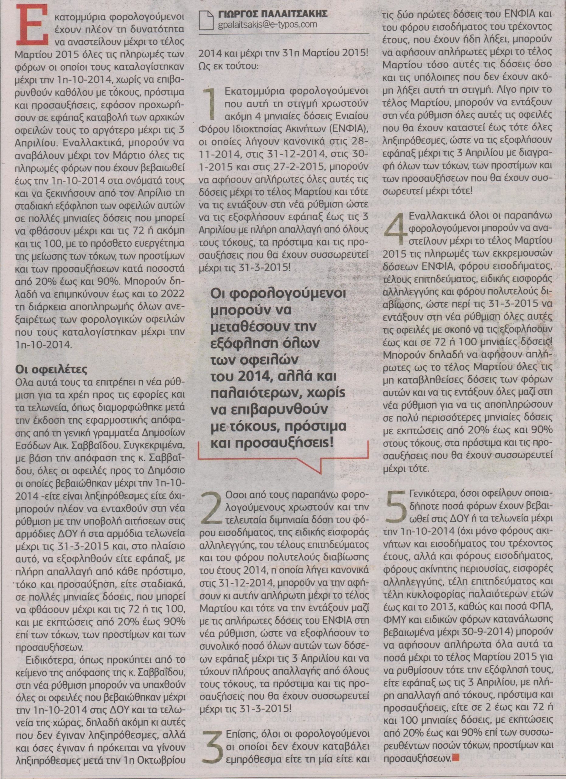 Εκατομμύρια φορολογούμενοι έχουν πλέον τη δυνατότητα να αναστείλουν μέχρι το τέλος Μαρτίου 2015 όλες τις πληρωμές των φόρων οι οποίοι τους καταλογίστηκαν μέχρι την 1η-10-2014, χωρίς να επιβαρυνθούν καθόλου με τόκους, πρόστιμα και προσαυξήσεις, εφόσον προχωρήσουν σε εφάπαξ καταβολή των αρχικών οφειλών τους το αργότερο μέχρι τις 3 Απριλίου.