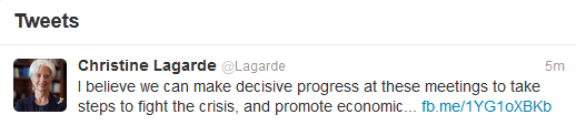 Η επικεφαλής του ΔΝΤ, Κριστίν Λαγκάρντ, με αφορμή τις επικείμενες “εαρινές συναντήσεις” των εκπροσώπων του Διεθνούς Νομισματικού Ταμείου και της Παγκόσμιας Τράπεζας, έγραψε στο twitter: “Πιστεύω ότι μπρούμε να κάνουμε αποφασιστικές προόδους σε αυτές τις συναντήσεις, προκειμένου να καταπολεμήσουμε την κρίση και να προωθήσουμε την οικονομική (ανάπτυξη”.
