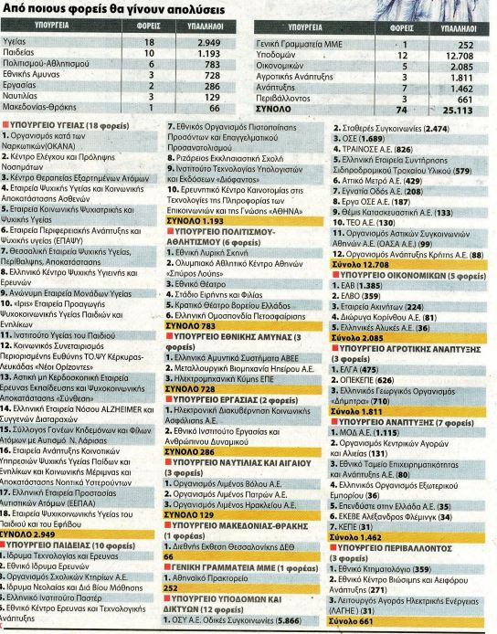 Πατήστε πάνω στον πίνακα και δείτε αναλυτικά από ποιους φορείς, σύμφωνα με την Ελευθεροτυπία, θα γίνουν οι απολύσεις: