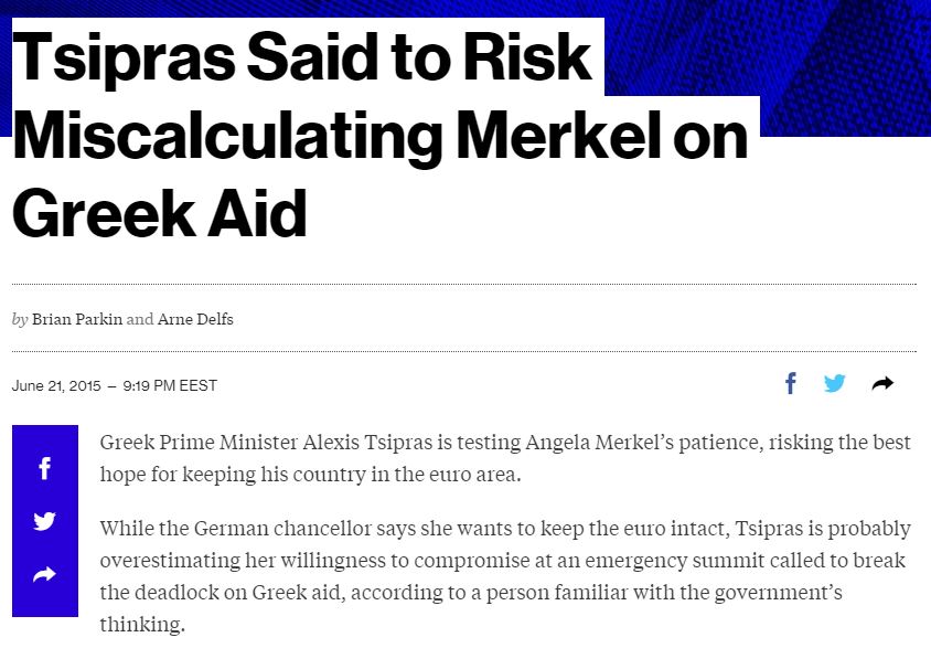 «Η Μέρκελ εξακολουθεί να τείνει το χέρι προς τους Έλληνες, όμως είναι αρκετά ξεκάθαρο αυτή τη στιγμή ότι δεν θα κινηθεί πέρα από το μέσο του τραπεζιού για να σφραγίσει μια συμφωνία με κάθε κόστος», σχολίασε ο Carsten Brzeski, οικονομολόγος της ING-DIba AG. «Οι έλληνες πρέπει να ξυπνήσουν γρήγορα και να καταλάβουν πως η Γερμανία έχει κάνει τα μαθήματά της και έχει υπολογίσει πως ένα Grexit είναι διαχειρίσιμο».