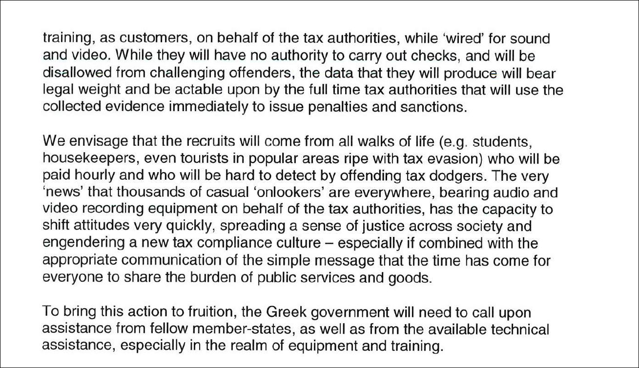“Προσβλέπουμε ότι θα προέλθουν από όλες κοινωνικές ομάδες, πχ φοιτητές, oικιακοί βοηθοί ακόμα και τουρίστες σε περιοχές με υψηλή φοροδιαφυγή”, επισημαίνεται στην επιστολή. Οι “μυστικοί” εφοριακοί θα πληρώνονται με την ώρα και θα είναι δύσκολο να γίνουν αντιληπτοί, όπως σημειώνεται.