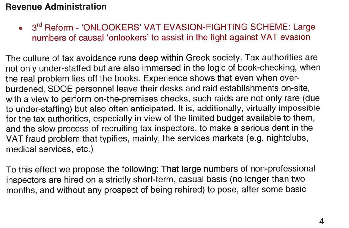 Συγκεκριμένα αναφέρεται στη συγκρότηση ευέλικτου σώματος στοχευμένων φορολογικών ελέγχων για την πάταξη της φοροδιαφυγής ΦΠΑ.