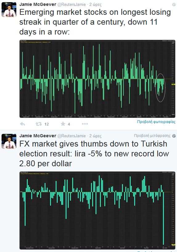 Αναταραχή στις αναδυόμενες αγορές και προβληματισμό στην ελληνική τουριστική βιομηχανία προκαλούν τα εκλογικά αποτελέσματα στην Τουρκία, με την κεντρική τράπεζα να μειώνει τα επιτόκια καταθέσεων συναλλάγματος μετά την κατάρρευση της λίρας.