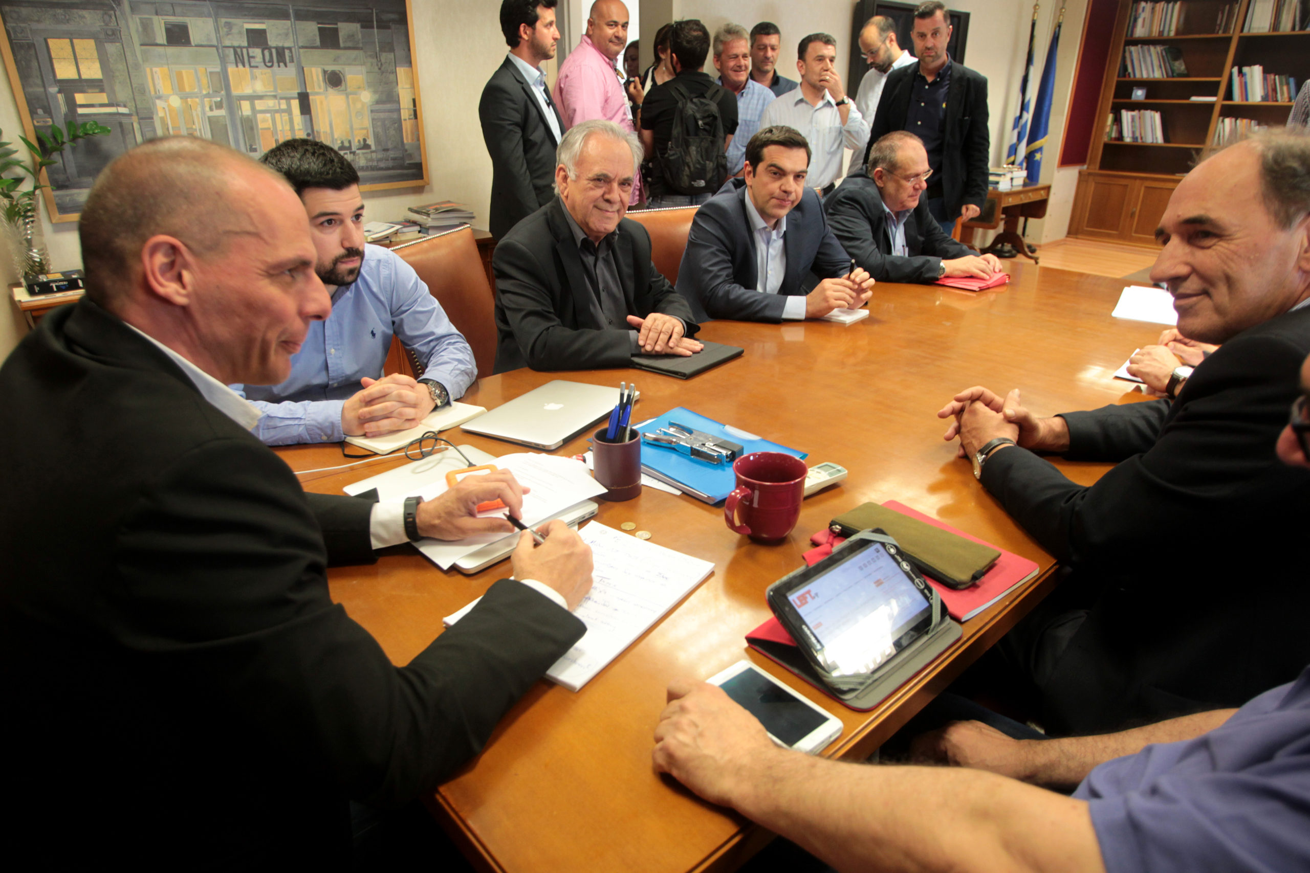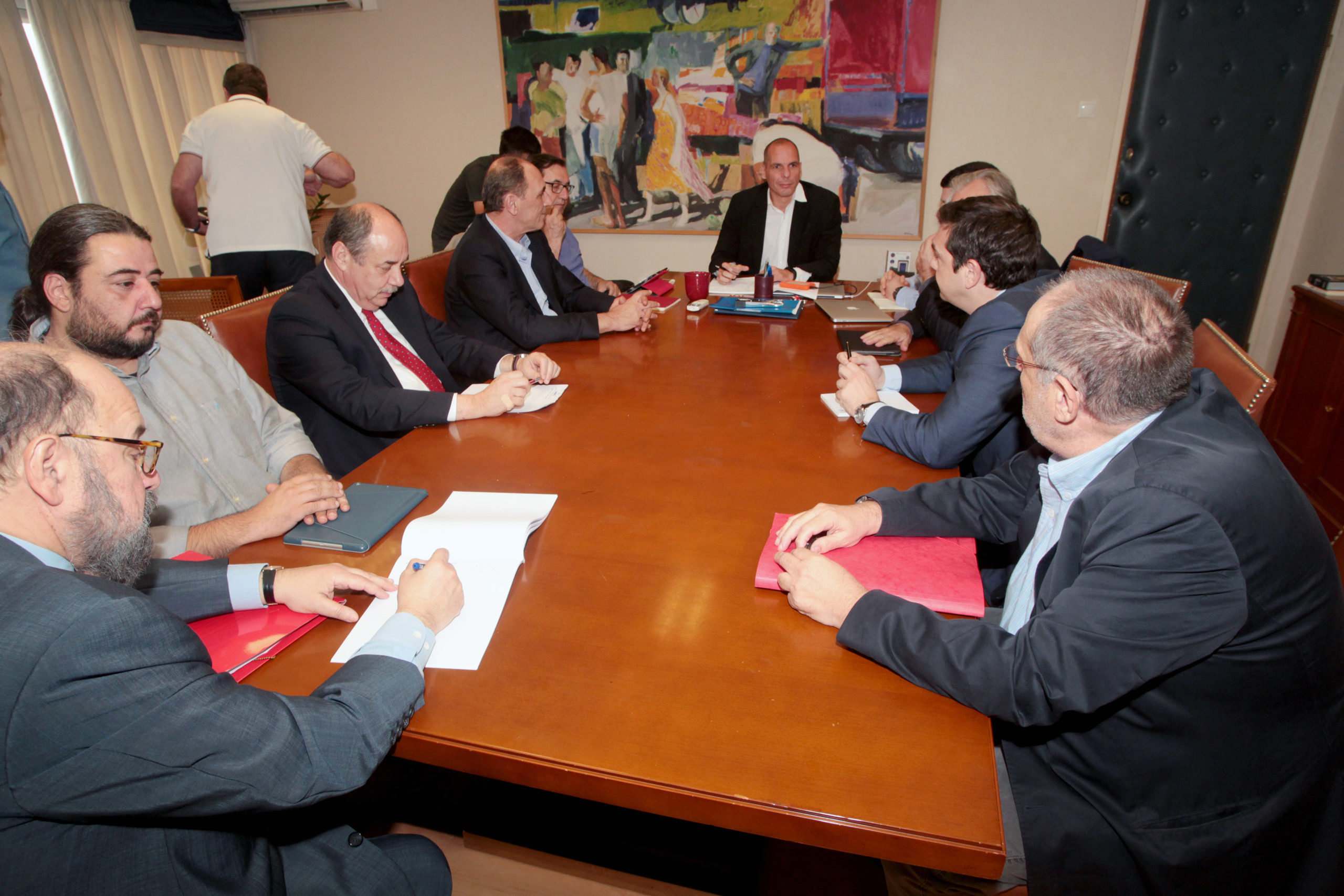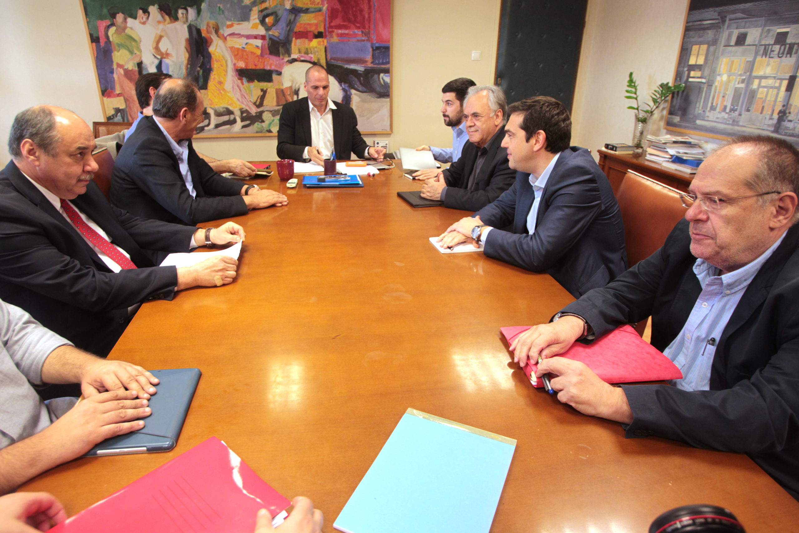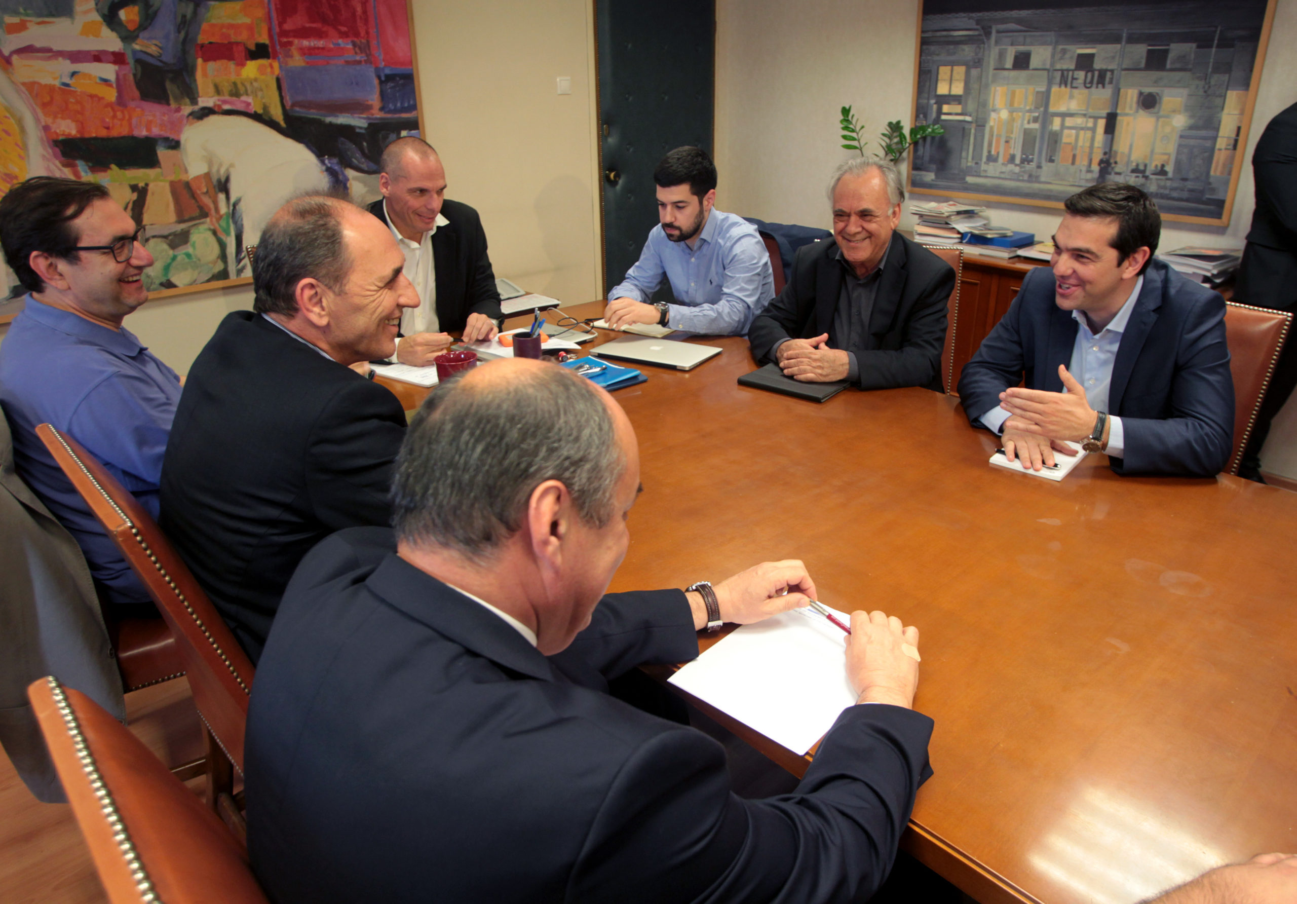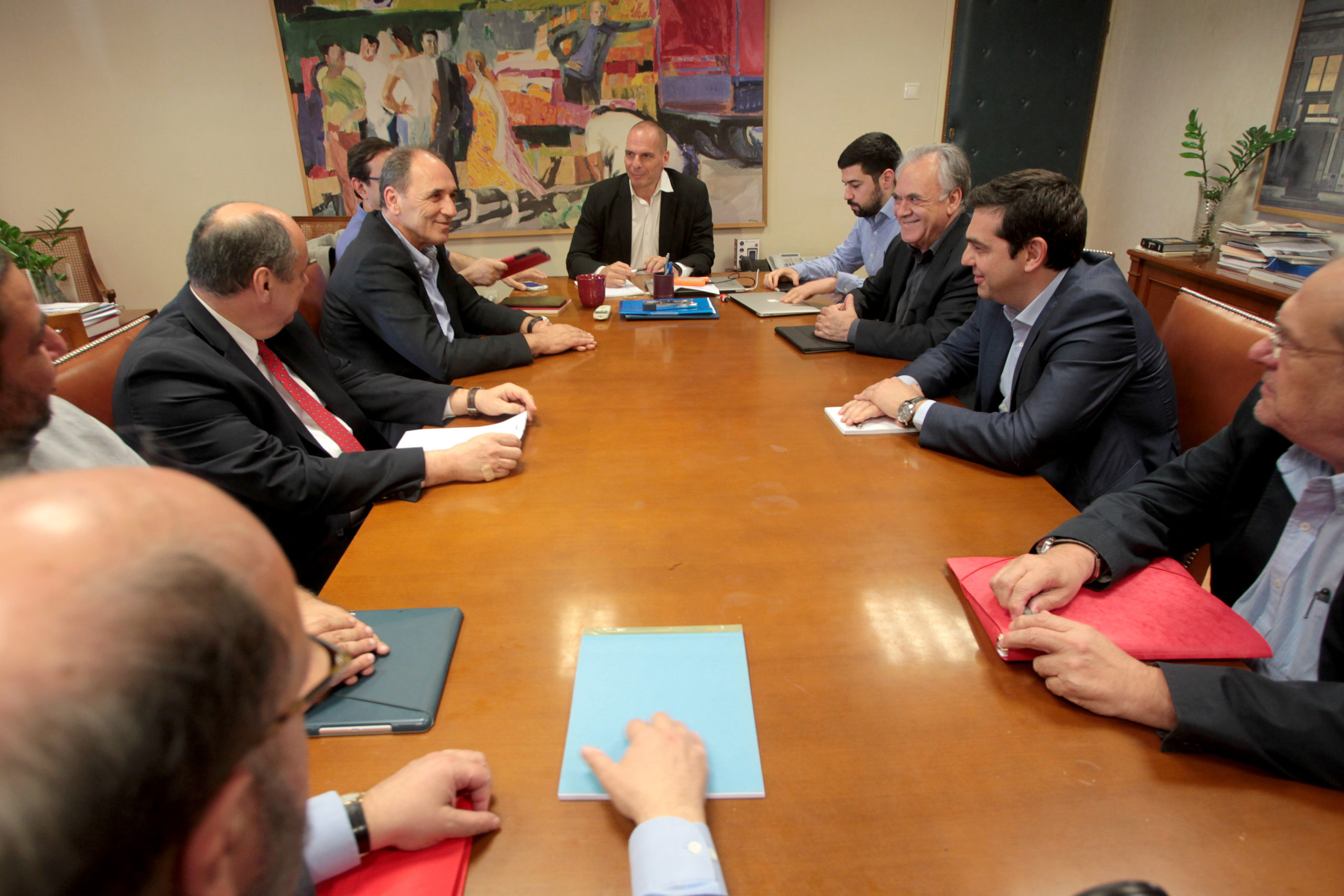 Ο Πρωθυπουργός Αλέξης Τσίπρας συνομιλεί με τον αντιπρόεδρο της Κυβέρνησης Γιάννη Δραγασάκη, τους Υπουργούς Οικονομικών Γιάνη Βαρουφάκη και Οικονομίας, Υποδομών, Ναυτιλίας και Τουρισμού Γιώργο Σταθάκη.