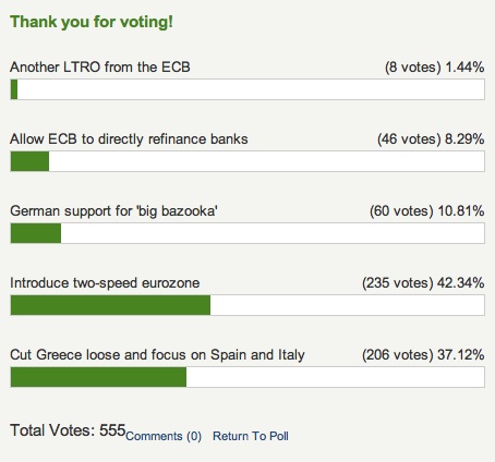 Στο κύριο άρθρο της για την οικονομική κρίση, τις ελληνικές εκλογές και τη Σύνοδο Κορυφής των G20, το οποίο ανανεώνεται διαρκώς με νέες πληροφορίες, η Telegraph θέτει το ερώτημα: “Τι χρειάζεται να κάνει η ευρωζώνη για να σταματήσει την εξάπλωση της οικονομικής κρίσης;” Οι αναγνώστες μπορούν να ψηφίσουν, επιλέγοντας μεταξύ πέντε λύσεων:1. Και άλλη μακροπρόθεσμη αναχρηματοδότηση από την Ευρωπαϊκή Κεντρική Τράπεζα;2. Να επιτραπεί στην Ευρωπαϊκή Κεντρική Τράπεζα να αναχρηματοδοτήσει κατευθείαν τις τράπεζες;3. Γερμανική υποστήριξη για το πακέτο μέτρων με τον τίτλο “big bazooka” (ανάμεσα στα μέτρα είναι η δημιουργία ενός ταμείου με “υπόλοιπο” έως 2 τρισ.ευρώ για την υποστήριξη τραπεζών και χρεωκοπημένων αγορών)4. Δημιουργία ευρωζώνης δύο ταχυτήτων;5. Να αφήσει την Ελλάδα να φύγει και να εστιάσει στην Ισπανία και την Ιταλία;Aπό τα μέχρι στιγμής αποτελέσματα, φαίνεται ότι οι περισσότεροι υποστηρίζουν την τέταρτη και την πέμπτη επιλογή…