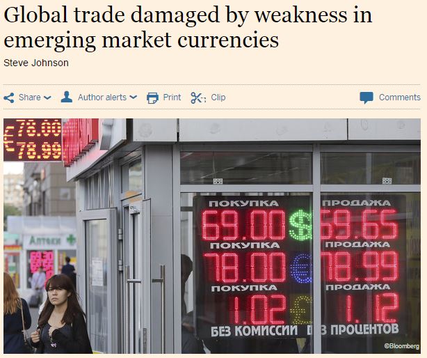 Η αδυναμία στα νομίσματα των αναδυόμενων αγορών βλάπτει το παγκόσμιο εμπόριο με τη μείωση των εισαγωγών, χωρίς κανένα όφελος για τους όγκους των εξαγωγών, σύμφωνα με έρευνα να FT έρευνα που βασίζεται σε περισσότερες από 100 χώρες.