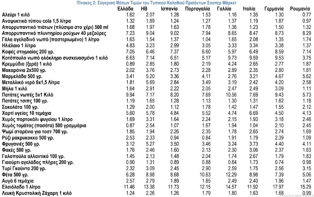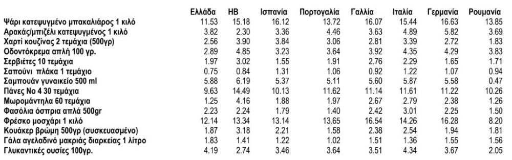 Η σύγκριση των μέσων τιμών των καλαθιών (πίνακας 1) δείχνει ότι και οι πεντε χώρες έχουν σημαντικά ακριβότερο μέσο καλάθι από την Ελλάδα, 24% η Γερμανία, 20% η Γαλλία, 25% το Ηνωμένο Βασίλειο, 16% η Ιταλία, 7% η Πορτογαλία, ενώ η Ισπανία και Ρουμανία είναι αρκετά κοντά με την Ελλάδα αλλά ακριβότερες κατά 5% και 1% αντίστοιχα.