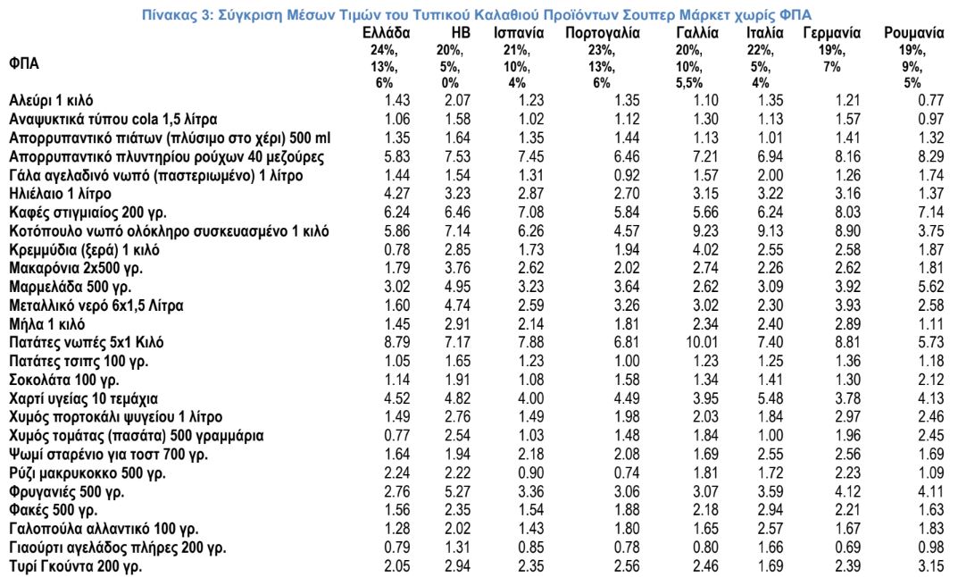 Η εικόνα των αποτελεσμάτων αλλάζει σημαντικά όταν αφαιρέσουμε τον αναλογούντα ΦΠΑ ανά χώρα για να γίνουν αντιληπτές τις πραγματικές τιμές των προϊόντων σουπερμάρκετ. Η σύγκριση των καλαθιών σε αυτή την περίπτωση (σχήμα 1 και πίνακας 1) δείχνει ότι οι και οι έξι χώρες έχουν πιο ακριβό μέσο καλάθι από την Ελλάδα, η Γερμανία κατά 31%, η Γαλλία κατά 28%, το Ηνωμένο Βασίλειο κατά 33%, η Ιταλία κατά 24%, η Ισπανία κατά 12% η Πορτογαλία κατά 10% και η Ρουμανία κατά 6%. Αυτό είναι αποτέλεσμα της διαφοράς που έχει ο χαμηλός ΦΠΑ ανά χώρα (πρόκειται για τον ΦΠΑ που αναφέρεται σε τρόφιμα και ποτά).