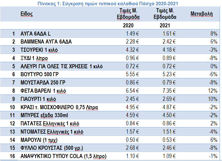 Το συνολικά χαμηλό συγκριτικά με την προηγούμενη δεκαετία επίπεδο τιμών του τυπικού Πασχαλινού καλαθιού είναι αποτέλεσμα της έντασης του ανταγωνισμού που καταγράφεται τα τελευταία χρόνια, τόσο στον κλάδο των σουπερμάρκετ, όσο και με τα ανταγωνιστικά κανάλια (π.χ. κρεοπωλείο, λαϊκή αγορά κλπ). Η διαφορά τιμών των καταστημάτων μεγάλων αλυσίδων σουπερμάρκετ από την υπόλοιπη αγορά (είναι αποτέλεσμα των οικονομιών κλίμακας, της αποτελεσματικής λειτουργίας των οργανωμένων τμημάτων προμηθειών των σουπερμάρκετ και της μακροχρόνιας συνεργασίας με οργανωμένους μεγάλους προμηθευτές.