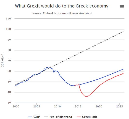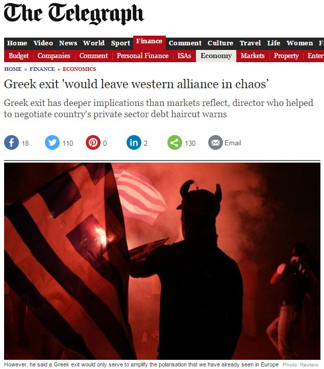 Θα έθετε «ολόκληρη τη συνοχή της δυτικής συμμαχίας υπό αμφισβήτηση», σημειώνει. «Μολονότι οι τράπεζες διεθνώς έχουν περιορίσει την έκθεσή τους στην Ελλάδα, η οποία αντιστοιχεί σε λιγότερο από το 2% του ΑΕΠ της ευρωζώνης και οι επενδυτές είναι πολύ «αδιάφοροι» για τις επιπτώσεις μιας ελληνικής εξόδου, κάτι τέτοιο θα μπορούσε να έχει σημαντικές πολιτικές προεκτάσεις και να ενισχύσει την πόλωση μεταξύ του πυρήνα και της περιφέρειας της ευρωζώνης».
