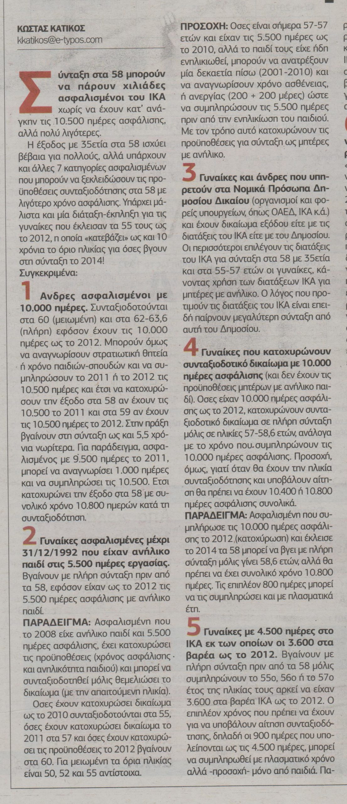 Σύνταξη στα 58 μπορούν να πάρουν χιλιάδες ασφαλισμένοι του ΙΚΑ χωρίς να έχουν κατ΄ ανάγκην τις 10.500 ημέρες ασφάλισης, αλλά πολύ λιγότερες, όπως αναφέρει ο “Ελεύθερος Τύπος”.