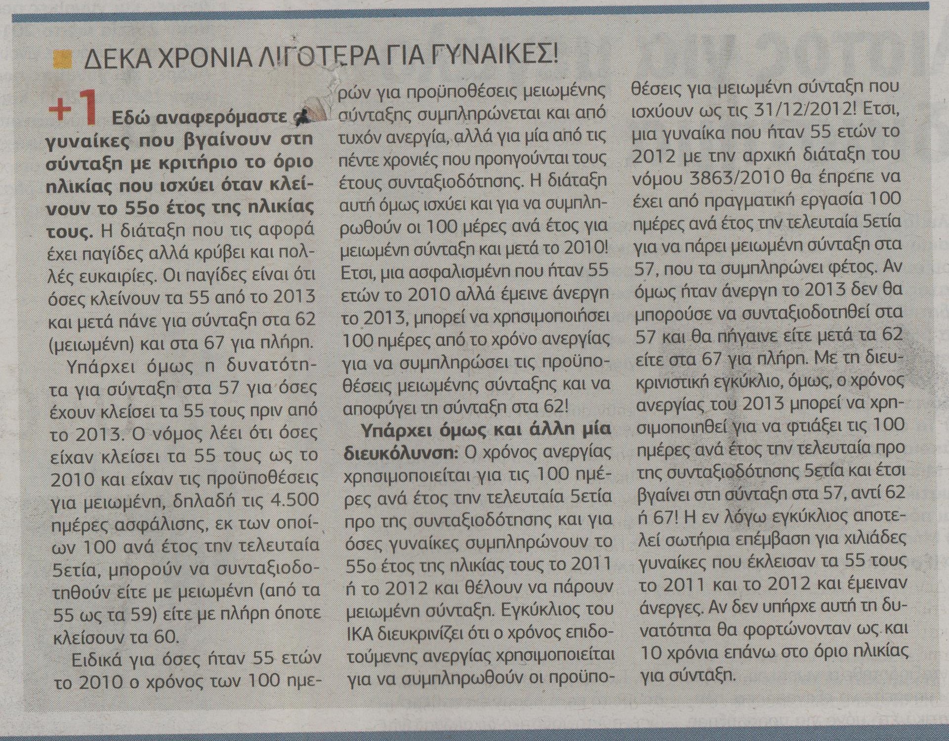 Η έξοδος με 35ετία στα 58 ισχύει βέβαια για πολλούς, αλλά υπάρχουν και άλλες 7 κατηγορίες ασφαλισμένων που μπορούν να ξεκλειδώσουν τις προϋποθέσεις συνταξιοδότησης στα 58 με λιγότερο χρόνο ασφάλισης. Υπάρχει μάλιστα και μία διάταξη-έκπληξη για τις γυναίκες που έκλεισαν τα 55 τους ως το 2012, η οποία “κατεβάζει” ως και 10 χρόνια το όριο ηλικίας για όσες βγουν στη σύνταξη το 2014.