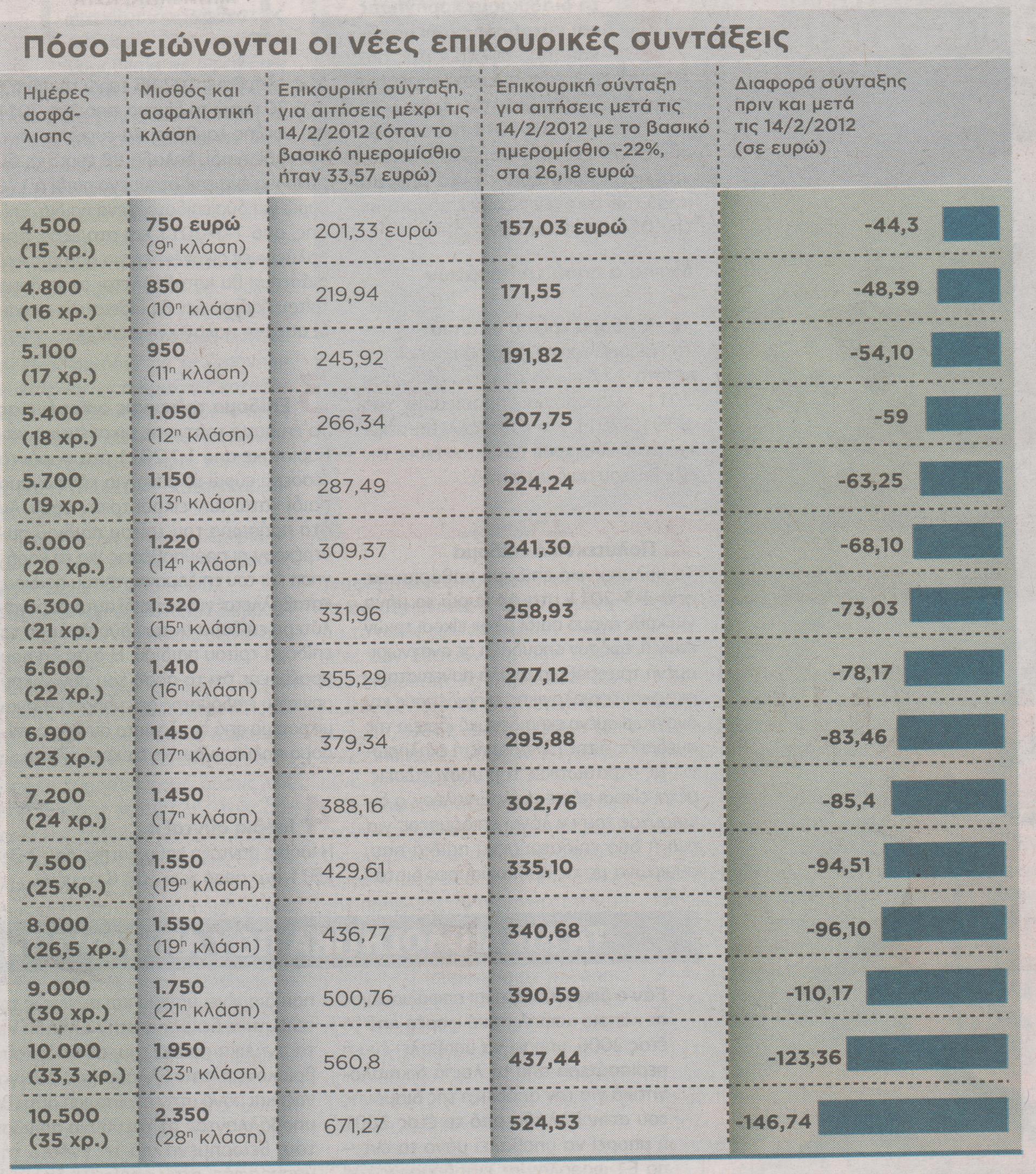 Ψαλίδι στις επικουρικές συντάξεις, πέραν αυτών που έχουν ήδη ανακοινωθεί και ισχύουν με τα δύο μνημόνια, έφερε η μείωση του βασικού ημερομισθίου κατά 22%. Και δεν είναι μόνο ότι ένας εργαζόμενος θα πάρει μικρότερη επικουρική, αλλά ότι για αυτή τη σύνταξη, τη μειωμένη, θα μπορούσε να είχε πληρώσει μικρότερες εισφορές.Στην ουσία, ενώ οι εισφορές του αντιστοιχούσαν σε μια επικουρική σύνταξη της τάξης των 400 ευρώ, τώρα θα φτάσει να παίρνει γύρω στα 230 ευρώ.Στους παρακάτω πίνακες φαίνεται ότι επικουρική των 400 ετών αντιστοιχεί σε 8.000 μέρες ασφάλισης (24 χρόνια), ενώ τα 230 ευρώ σύνταξης που απομένουν μετά τις περικοπές, αντιστοιχούν σε 6.000 μέρες ασφάλισης (18 χρόνια).Στην πράξη, ένας εργαζόμενος έχει πληρώσει εισφορές για 24 χρόνια, αλλά τελικά λόγω μνημονίου και μειώσεων του δίνουν σύνταξη που αντιστοιχεί σε εισφορές 18 ετών. ΔΕΙΤΕ ΑΝΑΛΥΤΙΚΟΥΣ ΠΙΝΑΚΕΣ-ΠΑΤΗΣΤΕ ΕΠΑΝΩ ΓΙΑ ΜΕΓΑΛΥΤΕΡΗ ΑΝΑΛΥΣΗ