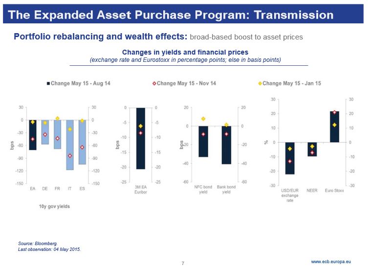 Τον περασμένο Μάρτιο η ΕΚΤ άρχισε να αγοράζει κρατικά ομόλογα χωρών μελών της ευρωζώνης αξίας 60 δισ. ευρώ σε μηνιαία βάση, ώστε να αυξηθεί η ρευστότητα στην ευρωπαϊκή οικονομία και να αντιστραφούν οι αποπληθωριστικές τάσεις.