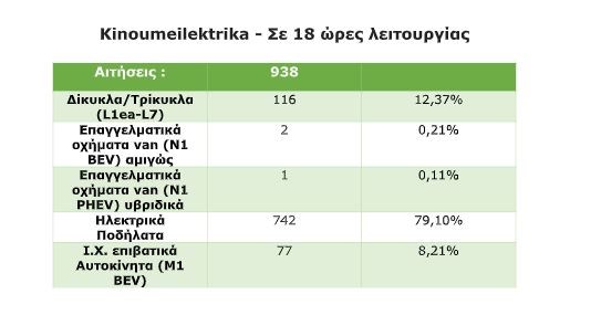 Όπως αναφέρεται σε σχετική ανακοίνωση του υπουργείου Περιβάλλοντος, πρωταγωνιστής ζήτησης αναδεικνύεται το ηλεκτρικό ποδήλατο καταλαμβάνοντας ποσοστό που αγγίζει το 80%, ακολουθούν τα ηλεκτρικά δίκυκλα και τρίκυκλα, ενώ καλή επίδοση παρουσίασαν και τα ηλεκτρικά αυτοκίνητα, καθώς μέσα σε μόλις 18 ώρες επιδοτήθηκαν 80, αριθμός που αντιστοιχεί σε ετήσιες πωλήσεις των τελευταίων ετών.
