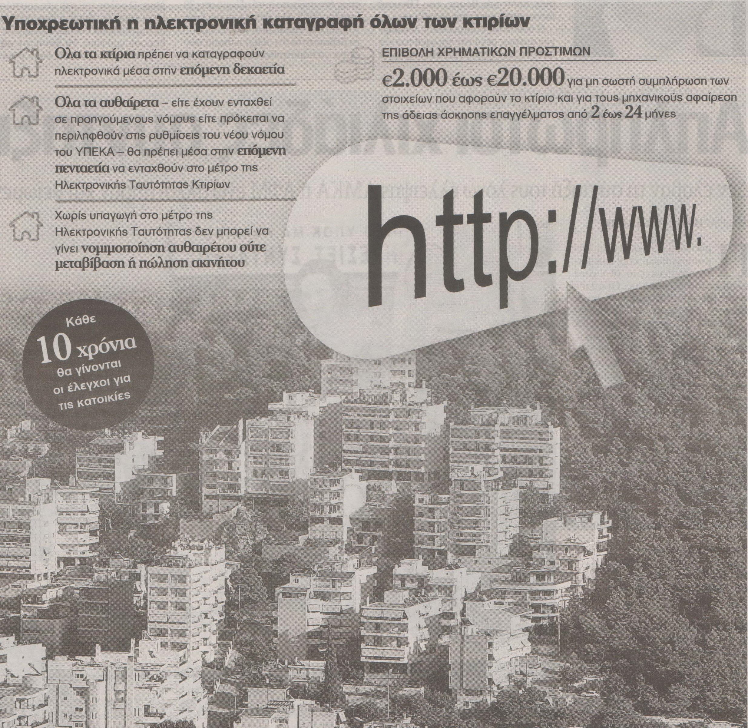 Όλα τα κτίρια είτε πρόκειται για αυθαίρετα είτε νόμιμα θα πρέπει να καταγραφούν ηλεκτρονικά με την υπαγωγή τους στην Ηλεκτρονική Ταυτότητα Κτιρίων, αλλιώς δεν θα μπορεί να γίνει καμία αγοραπωλησία, μεταβίβαση ή νομιμοποίηση.