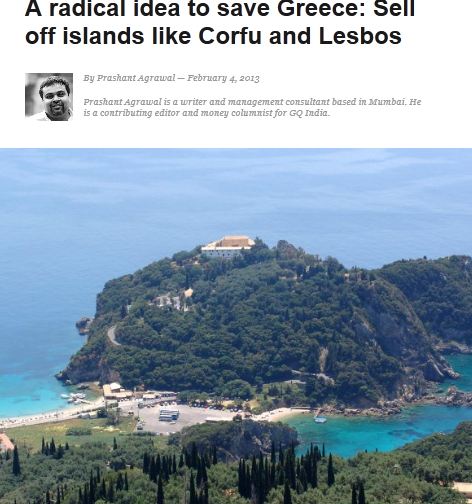 «Οι Έλληνες δεν έχουν άλλη επιλογή ή λύση από το αδιανόητο ξεπούλημα», αναφέρει ο Ινδός Οικονομολόγος Prashant Agrawal στο άρθρο του στο GQ Ινδίας που τιτλοφορείται «Μια ριζοσπαστική ιδέα για να σωθεί η Ελλάδα: Να ξεπουλήσει νησιά όπως την Κέρκυρα και τη Λέσβο».