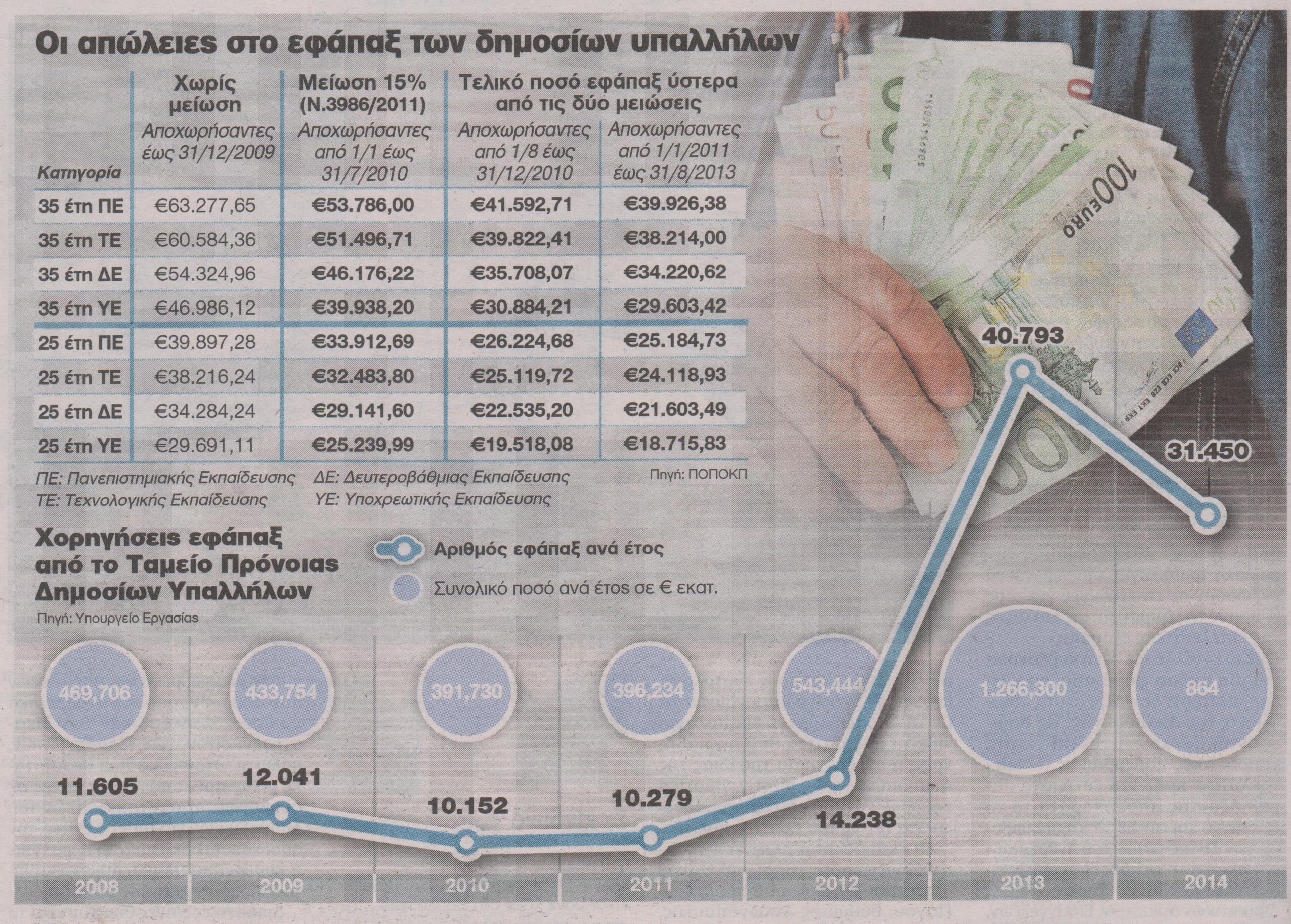 Σημειώνεται ότι χωρίς νέες μειώσεις θα υπολογιστεί το ποσό του εφάπαξ στους δημοσίους υπαλλήλους που συνταξιοδοτήθηκαν (εκδόθηκε πράξη συνταξιοδότησης) έως και τον Αύγουστο του 2013. Αυτή τη στιγμή είναι σε εκκρεμότητα 34.000 αιτήσεις για την καταβολή του βοηθήματος από τον φορέα του Δημοσίου, με τον χρόνο αναμονής να αγγίζει τους 15 μήνες.