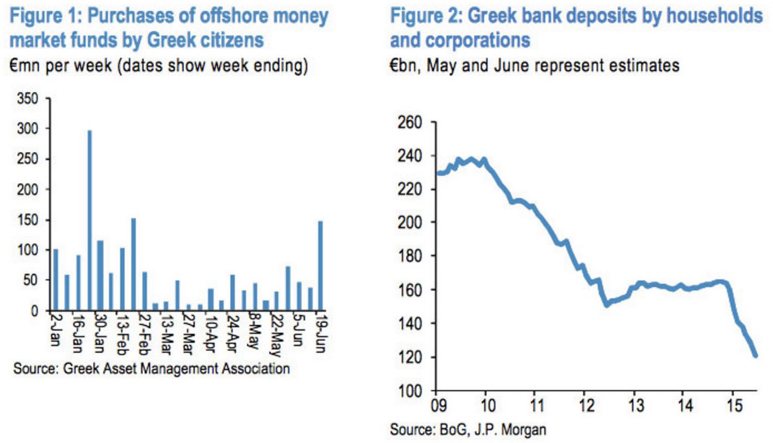 Όπως υπολογίζει η JP Morgan αυτά τα 44 δισ. που έχουν φύγει εκροές ευρώ έχουν επισκιάσει εντελώς τα 14 δισ. που είχαν εισρεύσει στην Ελλάδα από τον Ιούνιο του 2012 έως το Νοέμβριο του 2014. Συνολικά, οι αναλυτές της JPMorgan υπολογίζουν ότι τις εκροές καταθέσεων στην Ελλάδα στα 117 δισ. από τα τέλη του 2009, όταν ξεκινούσαν οι ανησυχίες για χρέος της χώρας στις αγορές.
