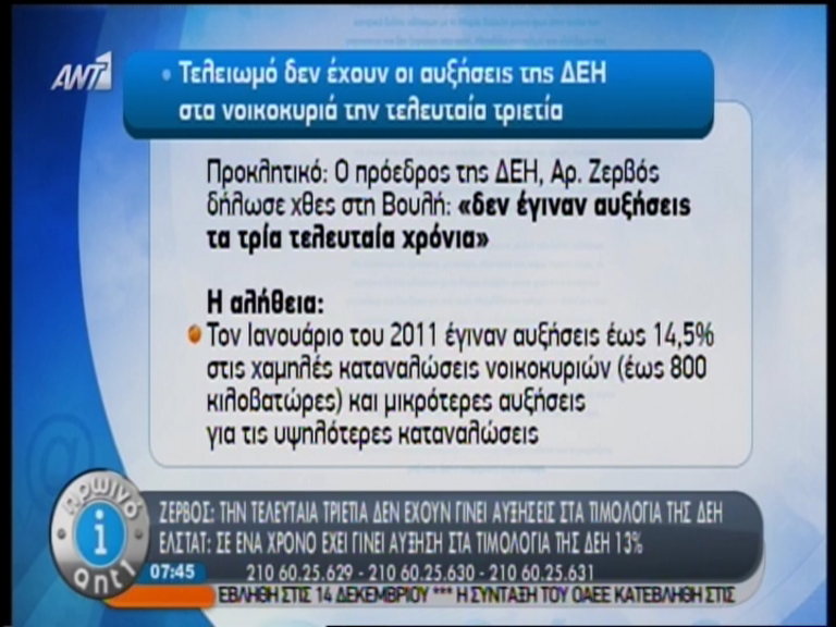 Πέραν του ότι υπήρξε ένσταση από τους παρουσιαστές της εκπομπής για την δήλωση του κ. Στεριώτη ότι η ΔΕΗ έχει ζημία, δεδομένου ότι ανακοίνωσε κέρδη 119 εκατ. ευρώ το πρώτο εννιάμηνο του 2012, πέραν του ότι ο κ. Στεριώτης μίλησε με ποσοστά για τις αποκοπές ρεύματος σε εξαθλιωμένα νοικοκυριά, δημιουργήθηκε θέμα όταν επανέλαβε τον χθεσινό ισχυρισμό του κ. Ζερβού πως δεν έχουν γίνει αυξήσεις στη ΔΕΗ την τελευταία τριετία.