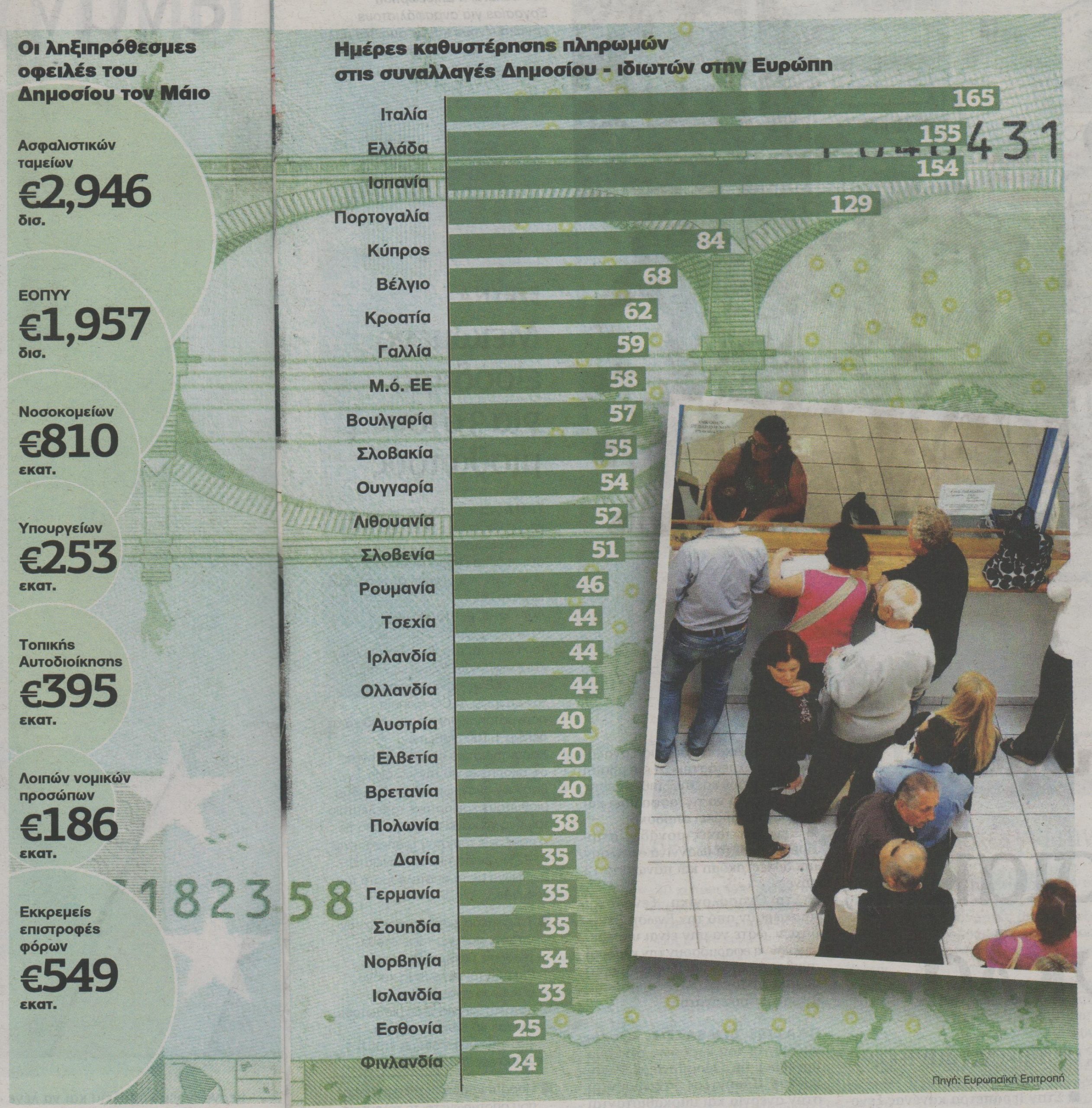 Απίστευτες είναι οι καθυστερήσεις από τις πληρωμές των οφειλών του Δημοσίου προς τους ιδιώτες: κατά μέσο όρο υπερβαίνουν τους πέντε μήνες, με αποτέλεσμα να παραβιάζεται κατάφωρα η νομοθεσία που ψηφίστηκε πέρυσι και προβλέπει ότι το κράτος θα εξοφλεί τις υποχρεώσεις του εντός 3 ημερών.