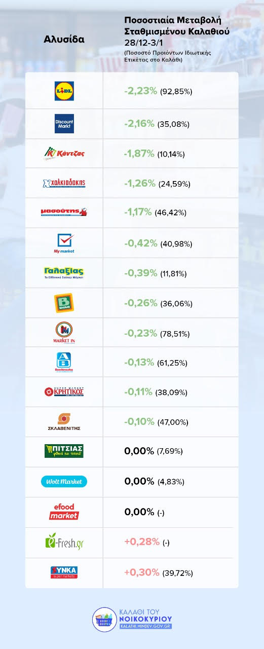 Όσον αφορά στην πρωτοβουλία για το «Καλάθι του Αη Βασίλη», από σήμερα, 28 Δεκεμβρίου μετέχουν 40 αλυσίδες με 1.991 παιχνίδια από 32 αλυσίδες με 1.560 παιχνίδια που ξεκίνησαν στις 14 Δεκεμβρίου. Οι τιμές στα παιχνίδια που προσφέρονται με έκπτωση παραμένουν αμετάβλητες. Αναλυτικά, από το σύνολο 850 προϊόντων στο «Καλάθι του Νοικοκυριού» που είναι απολύτως συγκρίσιμα: