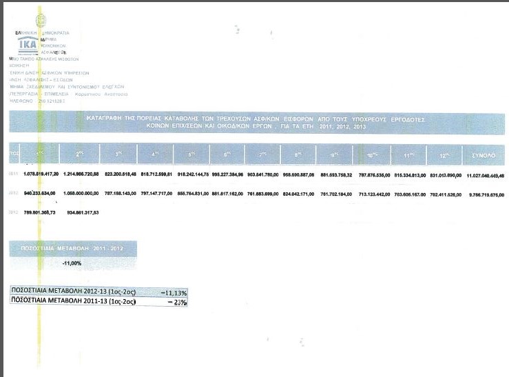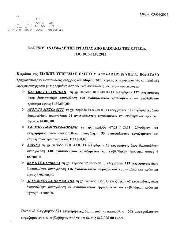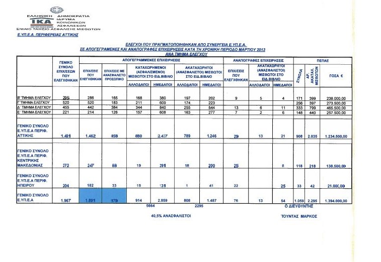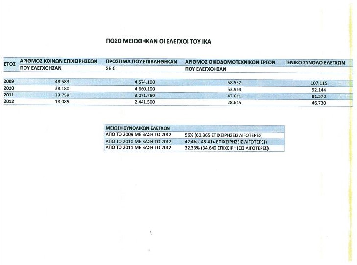 -οι ανύπαρκτοι έλεγχοι από τα καταστήματα του ΙΚΑ, οι οποίοι από 107.115 το 2009 μειώθηκαν στους 46.730 το 2012. Οι επιχειρήσεις που ελέγχθησαν από 48.483 το 2009 μειώθηκαν σε 18.085 το 2012. Η μείωση αυτή, καταγγέλλουν, προέρχεται από την άρνηση του υπουργείου Εργασίας και της Κυβέρνησης να χορηγήσει τα έξοδα κίνησης προκειμένου να συνεχιστεί το καθεστώς των ελέγχων σε ημερήσια βάση με πραγματική απόδοση.