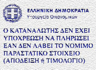 “Με αφορμή σημερινά δημοσιεύματα στον ηλεκτρονικό Τύπο, διευκρινίζεται ότι απολύτως καμία επαγγελματική δραστηριότητα δεν εξαιρείται από την υποχρέωση ανάρτησης πινακίδας με την οποία ενημερώνεται ο συναλλασσόμενος για το δικαίωμά του να μην καταβάλλει αντίτιμο των υπηρεσιών που έλαβε, εφ’ όσον δεν έχει λάβει και νόμιμο παραστατικό. Καμία εξαίρεση δεν υπάρχει επίσης και ως προς την ουσία του μέτρου, δηλαδή το δικαίωμα του καταναλωτή να μην πληρώσει αν δεν λάβει απόδειξη.